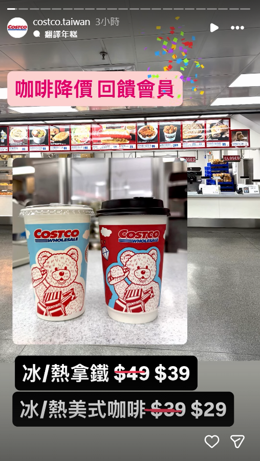 根據好市多官方IG帳號顯示,美式咖啡原價49元,降價為39元,拿鐵咖啡原價39元,降價為29元,降幅約20%至25%,而好市多披薩也微幅調降,從300元降為299元。