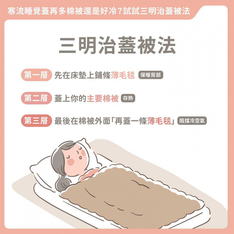 所謂「三明治蓋被法」,原理是讓身體在棉被與毛毯之間形成保溫層,具體做法分為三層: