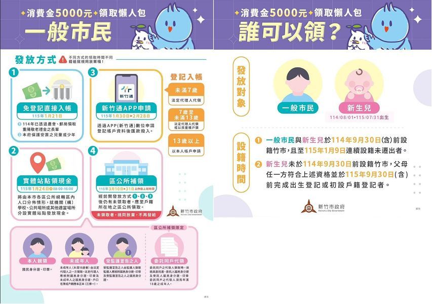 - 發放資格:114/9/30 前設籍新竹市、新生兒(114/8/1~115/7/31 出生)也納入