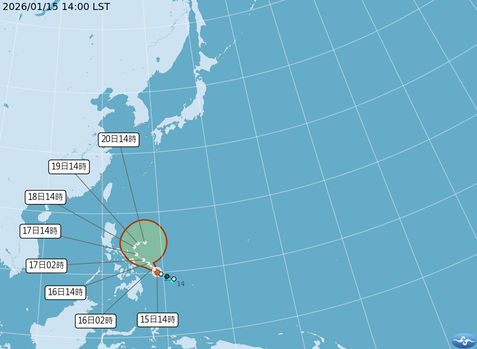 2026年首個颱風即將現身。根據中央氣象署資料,位於菲律賓東方海面的熱帶性低氣壓(TD01),預計今(15日)下午14時將發展為輕度颱風「洛鞍」,成為今年第一號颱風。其預測路徑將先朝西北方向行進,接著轉北、再轉偏東迴轉,雖對台灣無直接威脅,卻可能為下週的冷空氣帶來更多水氣,延長迎風面濕冷狀況。