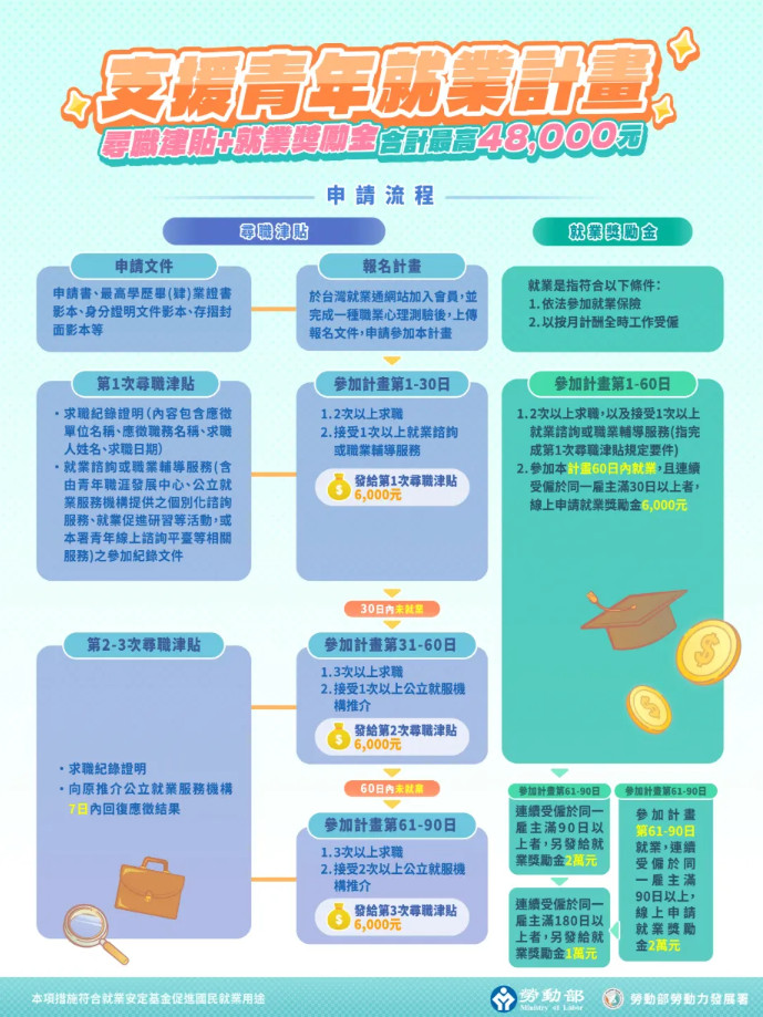 不只如此,只要在參加計畫後60天內找到工作,並穩定受僱於同一家公司,就能再申請就業獎勵金。