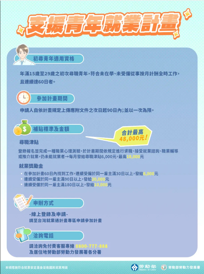勞動部表示,希望透過這項計畫,讓青年在找工作時不用太焦慮,先穩住生活,再慢慢找到適合自己的方向,順利踏出職涯第一步。