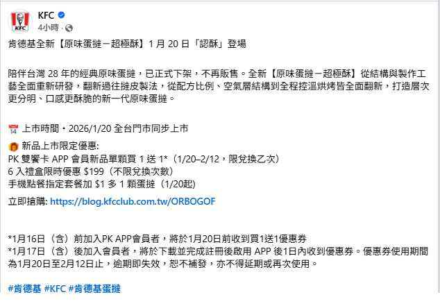 隨後,肯德基於16日上午11點進一步說明,經典蛋撻已全面下架,改由全新「原味蛋撻-超極酥」上架取代。品牌表示,新版本主打層次分明與更酥脆的口感,並強調為回應市場期待所進行的升級調整。