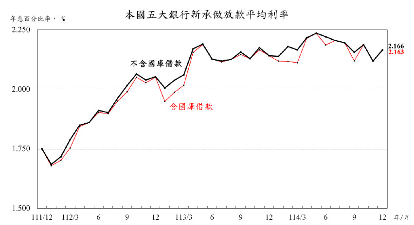 較11月的2.119%上升0.044個百分點,係因週轉金貸款利率較11月上升所致。若不含國庫借款,上年12月五大銀行新承做放款加權平均利率為2.166%,亦較11月的2.119%上升0.047個百分點。