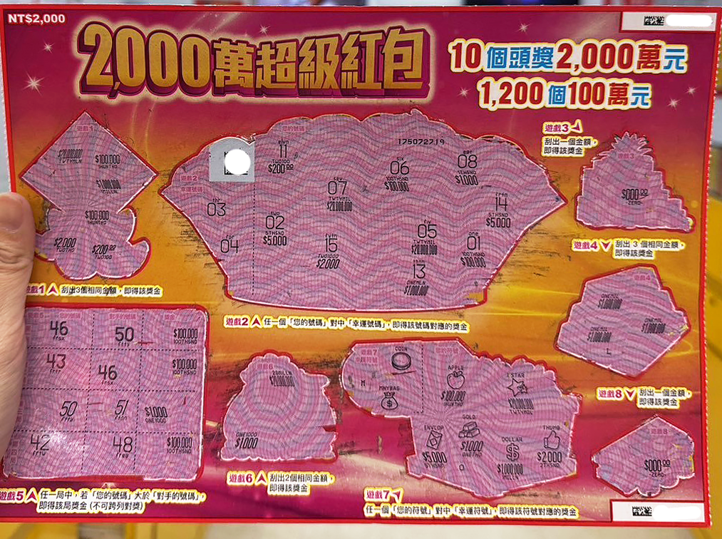 根據代理人柯小姐轉述,幸運刮中「2000萬超級紅包」100萬元的是兩位年約30歲的女性。當天兩人盛裝走進彩券行買了3張「2000萬超級紅包」即幸運刮中100萬元大獎。兩人在刮獎過程中相當冷靜,發現中獎後沒有歡呼,而是先拿起手機用APP掃描Qrcode反覆確認,確定中獎後才露出微笑。