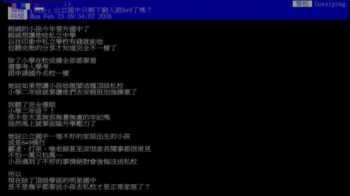 古時候有「孟母三遷」,強調孩子成長環境對學習的重要性,如今也有家長為了求學氛圍與安全考量,選擇讓孩子報考私立國中而非就讀公立。一名網友在網路論壇PTT發文指出,親戚的孩子今年將升國中,家人因擔心公立國中可能遇到「家庭狀況較複雜」或所謂「8+9」學生,決定改走私校路線,該網友聽完後直呼傻眼,並拋出疑問「公立國中只剩窮人跟8+9了嗎?」引發兩派討論。