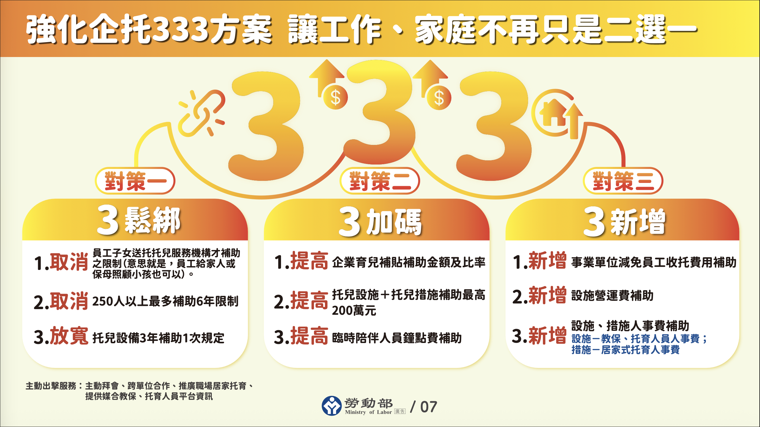 - 提高「托兒設施」、「托兒措施」補助上限,每年最高補助提高為100萬元。