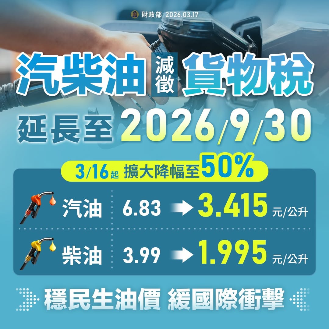 財政部表示,自今年3月16日起將進一步擴大貨物稅的降幅至法定上限50%。具體的稅額調整細節顯示,汽油部分由原本每公升6.83元調降至3.415元;柴油部分則由每公升3.99元調降至1.995元。透過大幅度直接削減稅賦負擔,政府期望能更有效地緩解物價上漲的連鎖反應。