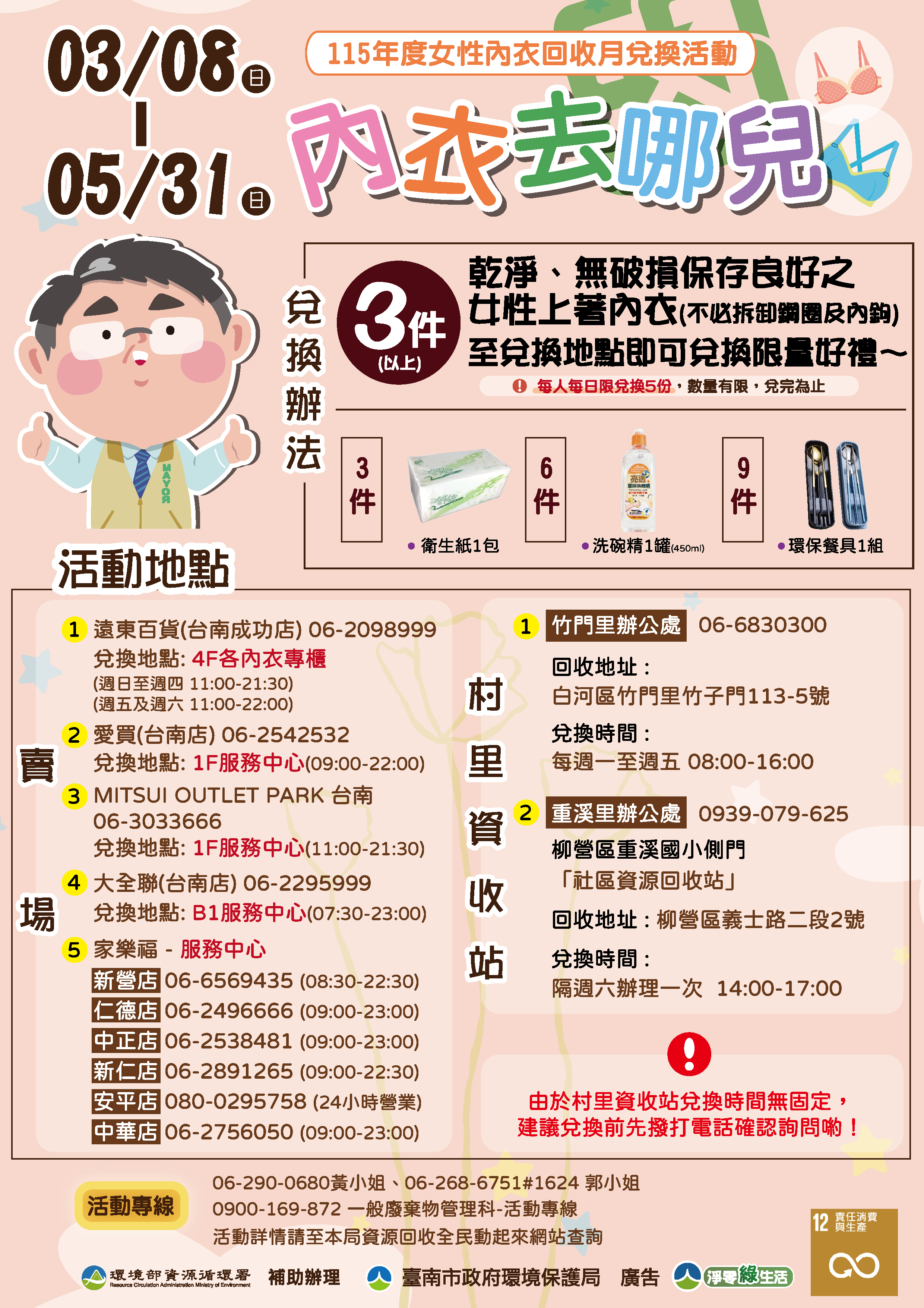 台南市長黃偉哲表示,此活動自2022年起推動,結合婦女節與母親節期間辦理,不僅提供民眾整理衣物的契機,也傳遞永續環保理念。每一件回收的內衣,都象徵對環境保護的一份心力。