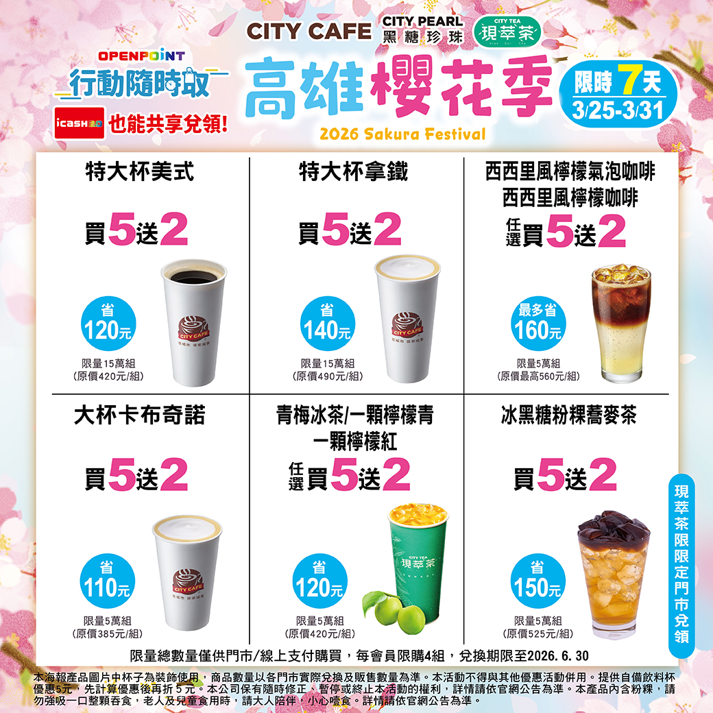 特大杯拿鐵買5送2,省140元。