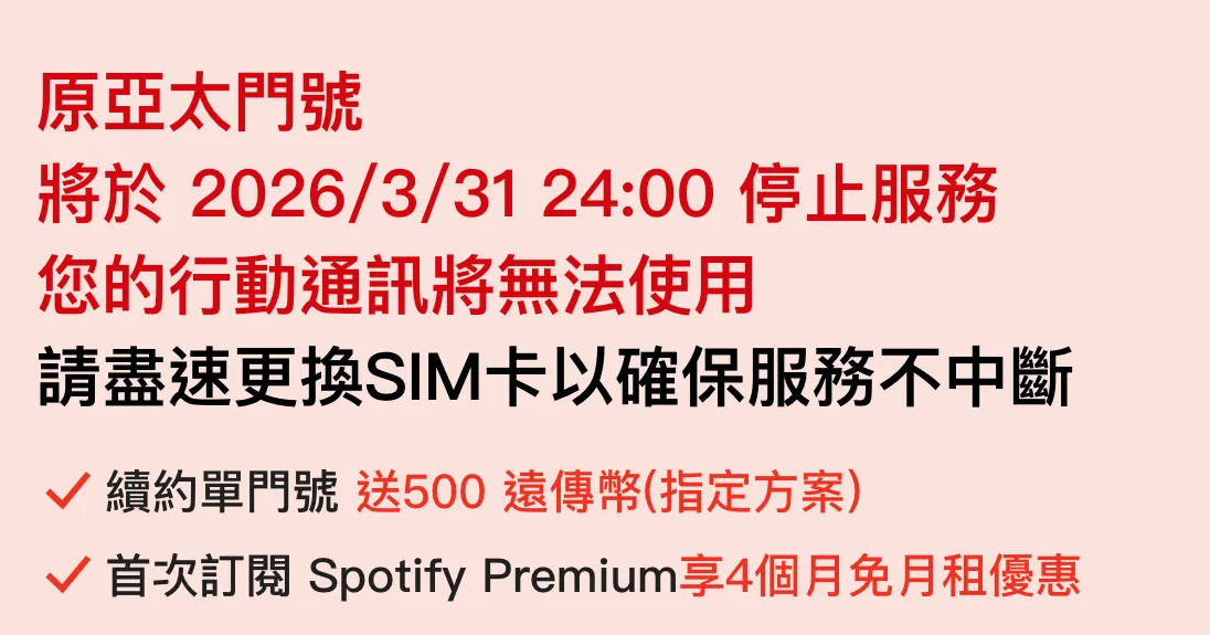 合併亞太電信、完成整合後,遠傳電信在今年3月26日公告,原亞太電信 SIM 卡將於 2026 年 4 月 1 日凌晨 0 時起全面停止服務。屆時若用戶尚未更換為遠傳 SIM 卡,手機無法撥打電話、接收簡訊或使用行動網路,門號亦會被暫停使用,等同於與外接失聯。系統停用後,用戶最快須等到 4 月 2 日 才能臨櫃辦理復機程序,如果又錯過,那可能就要等清明連假後才有可能辦理手續了。