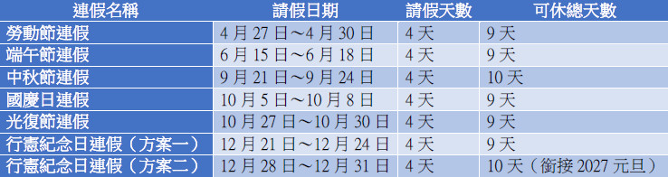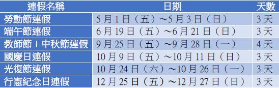 至於10月則有兩波連假,包括國慶日與光復節,各為3天假期,若分別搭配4天特休,也都能延長為9天假期。