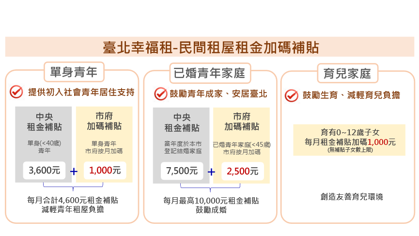 為協助青年與婚育家庭在臺北市順利扎根,臺北市政府都市發展局特別針對在臺北市一般租屋市場租屋的「單身青年」、「已婚青年家庭」以及「育兒家庭」推出「臺北幸福租-民間租屋租金加碼補貼」。根據都發局說明,只要民眾獲准中央「300億元擴大租金補貼專案」且設籍於臺北市,即可申請此項專案,為青年及婚育族群提供更穩定的實質支持。