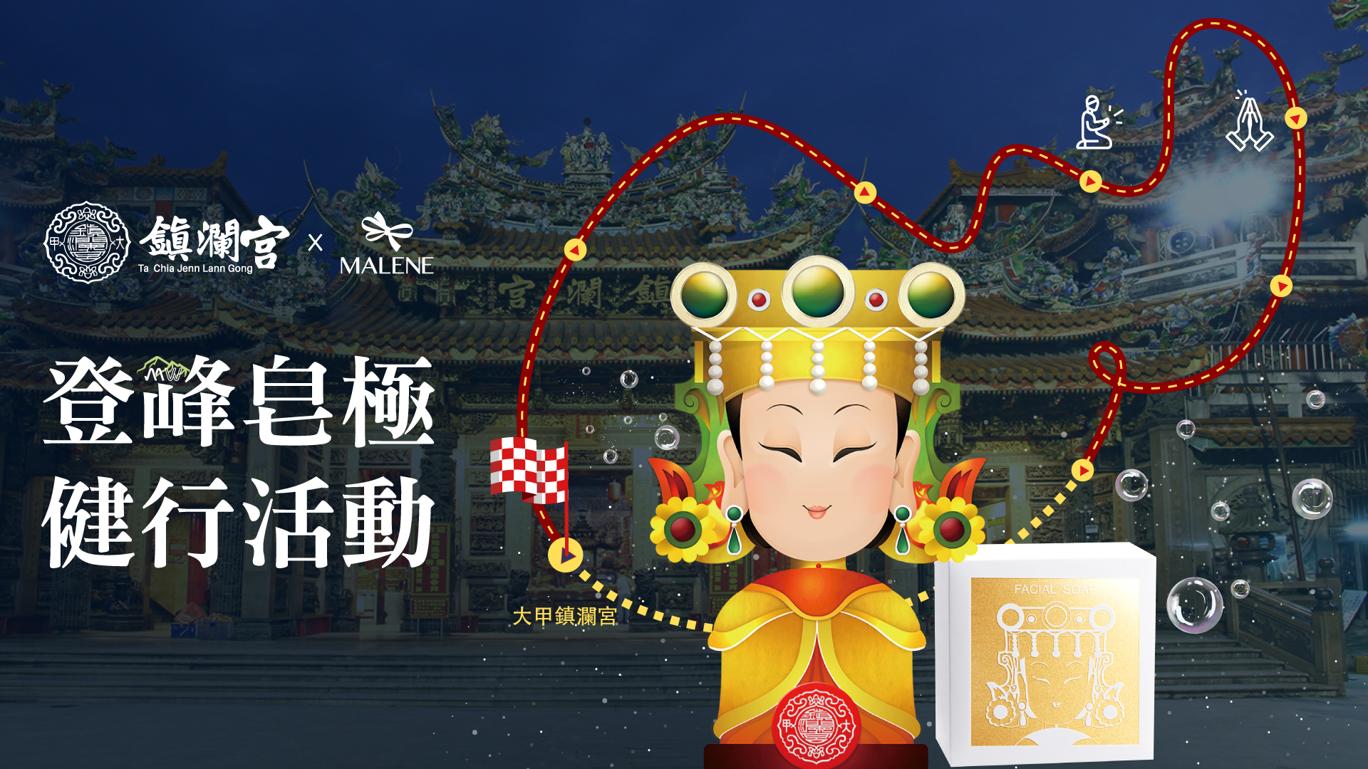 為讓信眾深度體驗遶境文化,MALENE 媚鹷結合《登山世界APP》,舉辦媽祖全程九天八夜的 《登峰皂極》健行活動,紀錄信眾每一步的祈福足跡。活動推出限定應援方案:每日於媽祖遶境路徑上的指定廟宇成功打卡拍照上傳,即可獲得 MALENE亮顏小皂,更有機會抽中知名運動品牌好禮與 百元媽祖紅包。