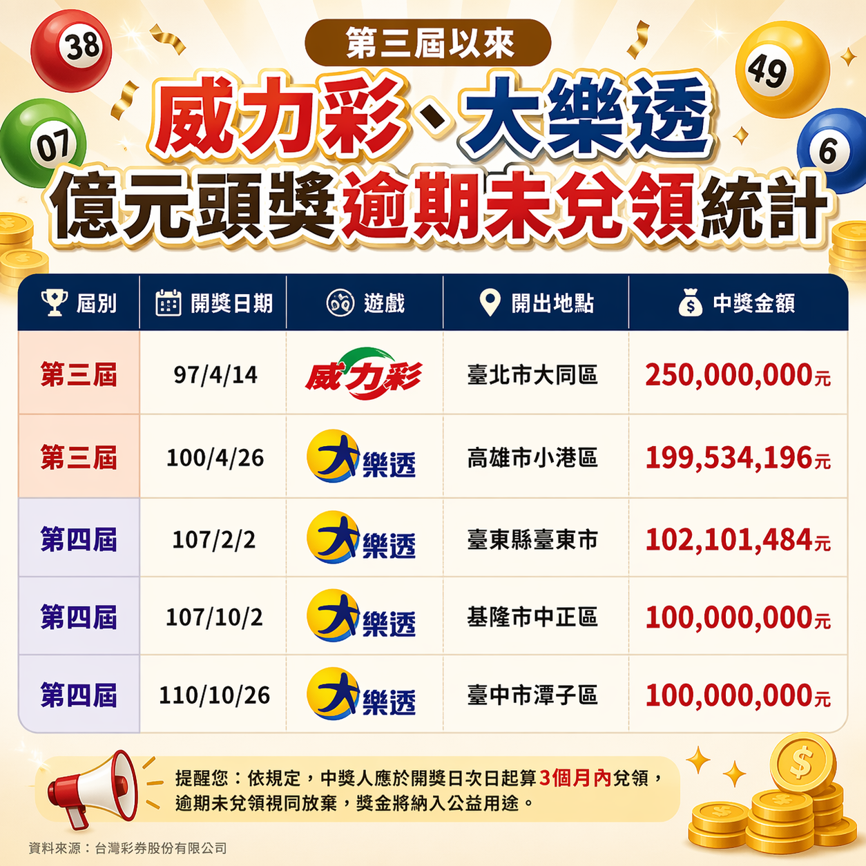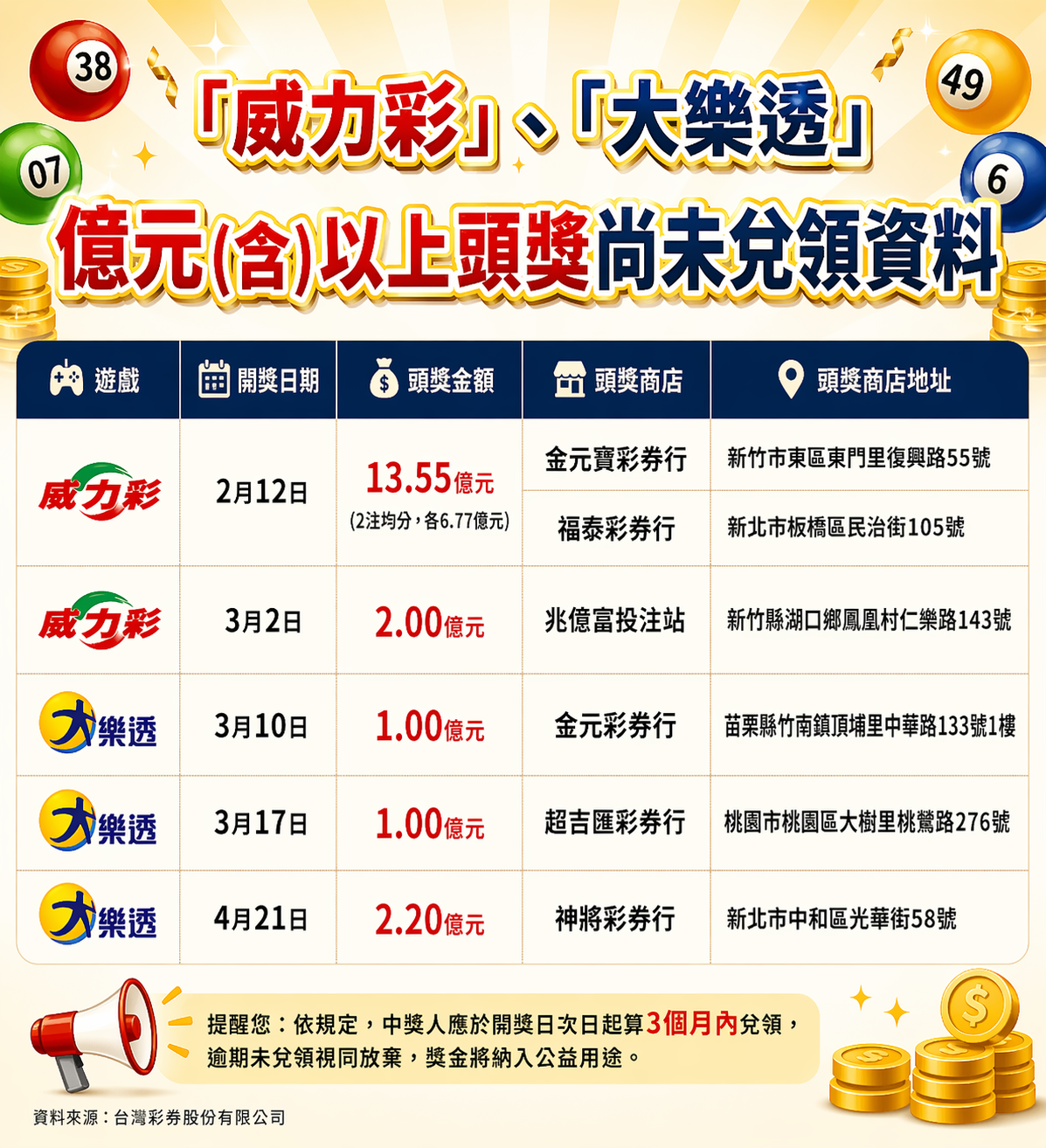 根據台灣彩券最新數據顯示,今年度待領的億元大獎名單除了最受矚目的2月12日兩注威力彩(每注6.77億元)外,還有4筆「大樂透」頭獎得主同樣尚未完成領獎程序。這6筆獎金合計總額相當可觀,且皆已進入領獎期限的倒數階段。台彩表示,這些幸運兒或許是因為忙碌、遺忘,甚至可能是彩券遺失而不知情,若超過3個月的領獎期限,這些獎金將全數沒入,歸入公益彩券盈餘。