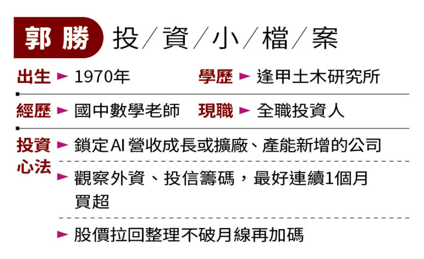 「做股票,一定不要隨便聽小道消息,要自己研究做筆記;尤其基本面最重要,選股就要買有護城河的公司。」曾是國中數學老師的郭勝,這幾年將自己的投資心法及實戰經驗歸納傳授,學生從軍人、博士、消防員到公務員;能牢牢抓住軍公教、相對保守派的心,主要原因就在他審慎選股,及嚴謹的資金控管策略。