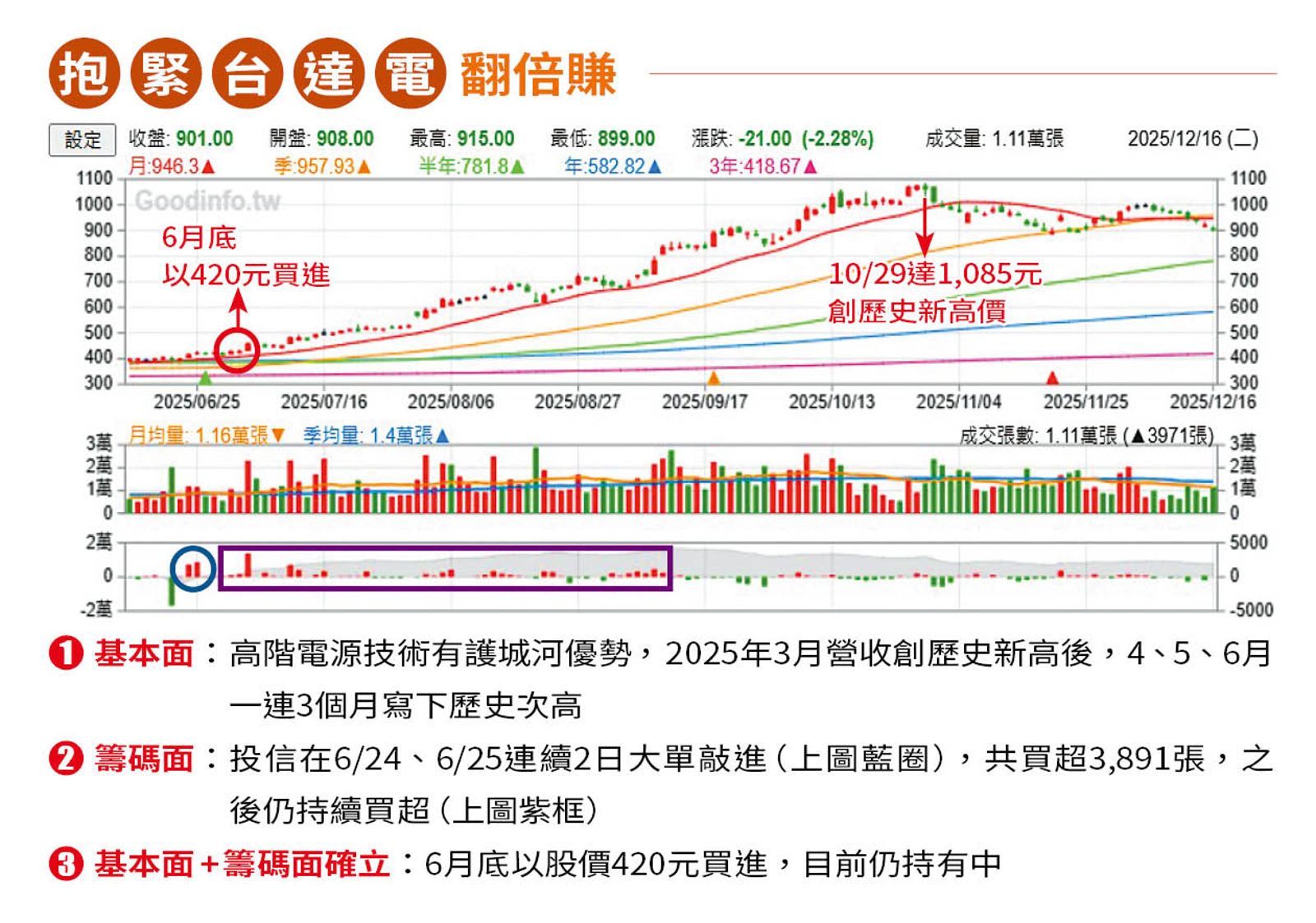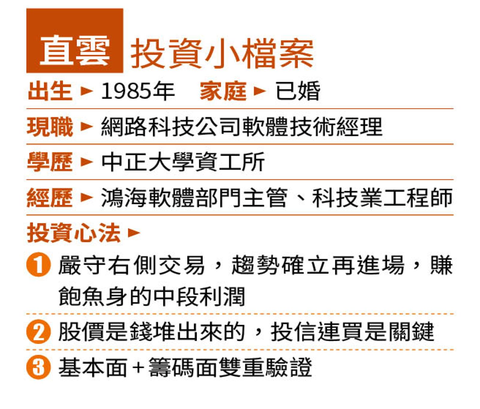 營收持續正增長的基本面確認後,再評估籌碼面,「投信有龐大研究團隊支撐,資源比我們多太多,我認為連續買超2天就是趨勢確認的訊號,投信看基本面買,我們緊跟上車,等於是站在巨人的肩膀上賺錢。」直雲在2025年靠著這套心法,緊跟投信腳步進場南亞科、台達電,抱股至今翻倍賺。