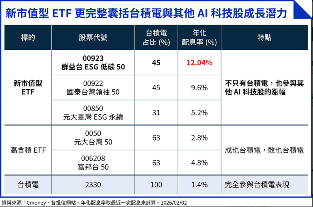 ▼高含積ETF成也台積電敗也台積電,新市值型ETF不單壓台積電更能享受AI題材漲幅。(資料來源:CMoney;資料日期:2026/ 02 / 02、鏡週刊製表。)