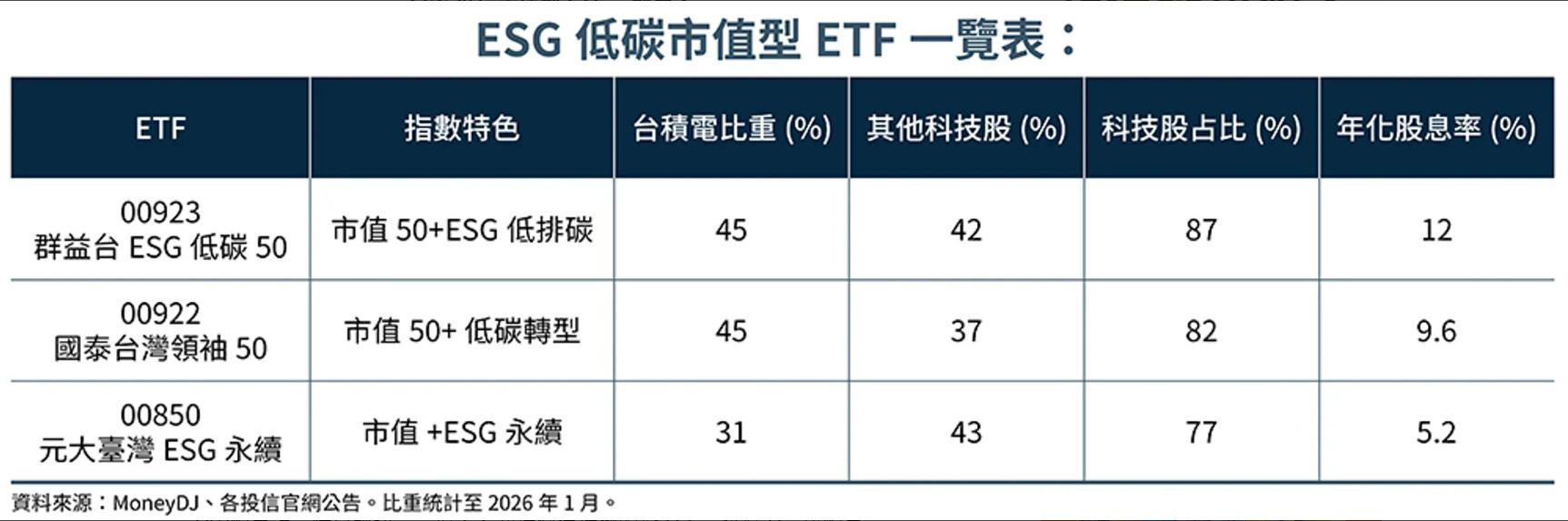 ▼ESG低碳市值型ETF一覽表。(資料來源:MoneyDJ、各投信官網公告。比重統計至2026年1月。鏡週刊製表)