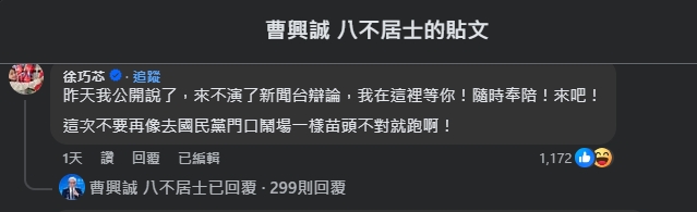 曹興誠昨在其臉書「曹興誠 八不居士」指徐巧芯不敢見光,他老早就邀請公開辯論,「但是她不敢出來,只敢躲在她的同溫層裡謾罵叫囂」。徐巧芯隨後在底下留言表示,「來不演了新聞台辯論,我在這裡等你!隨時奉陪!來吧!這次不要再像去國民黨門口鬧場一樣苗頭不對就跑啊!」