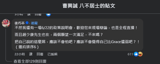 隨後徐巧芯又補充留言「不然我還有一場6/22的政策說明會,歡迎您來現場辯論,也是全程直播!而且趙少康先生也在,兩個願望一次滿足,不來嗎?把自己說的這麼屌,應該不會怕吧?應該不會覺得自己比Grace還弱吧?!(邀約排序6)」