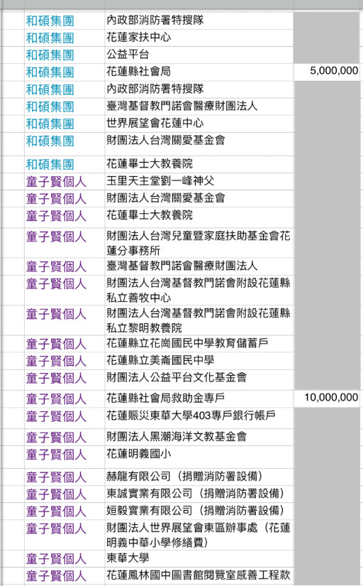 童子賢與和碩集團選擇將捐款直接提供給當地的學校及機關團體,捐助對象包括花蓮縣政府社會局、社會局救助金專戶、消防署特搜隊、消防署設備採購、世界展望會、公益平台、花崗國中、美崙國中、鳳林國中、明義國小、門諾醫院、東華大學、善牧中心、花蓮家扶中心、花蓮黎明教養院、玉里天主堂、玉里安德啟智中心、花蓮畢世大教養院、花蓮黑潮基金會等24個單位。