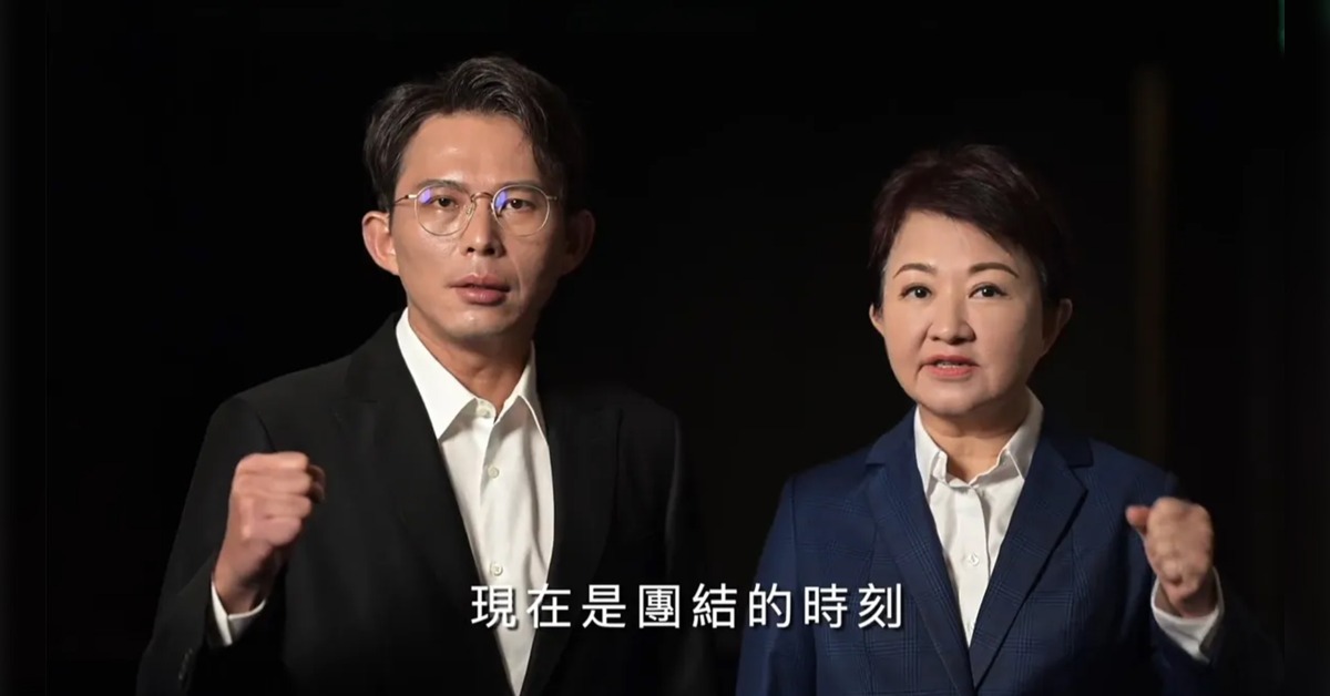 ▼電視台22日曝光台中市長盧秀燕與民眾黨主席黃國昌合體反罷廣告,影片中兩人同喊「現在是團結的時刻」。(圖/國民黨台中市黨部提供)