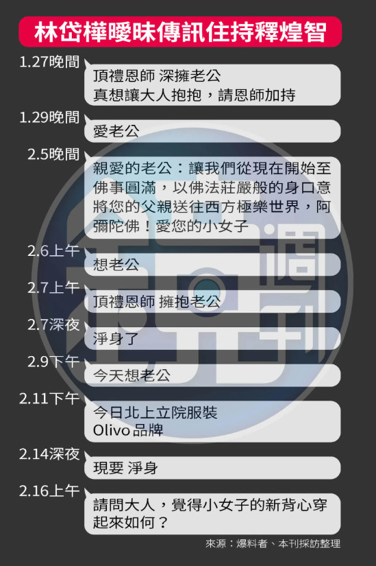 ▼林岱樺手機對話更驚現稱住持「老公」、「愛您的小女子」等曖昧訊息及暱稱。(圖/鏡週刊)