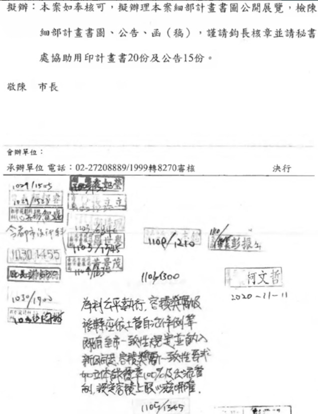 檢察官指出,柯文哲對於京華城公司申請變更細部計畫審查、審議過程,確有憑恃其市長職權積極介入干涉,致使公告公展的辦理與嗣後都委會審議等行政流程,速度均異於常情。 柯文哲2020年10月26日下手諭的隔天,都發局承辦人即完成公告公展簽呈,時任北市府副秘書長李得全於核閱這公告公展簽呈時,原本認這簽呈所載容積獎勵的依據,並不符合公平執行原則,在11月5日下午1時45分許退回簽文,另以黃色便條紙貼附於簽呈,內容記載「為利公平執行,容積獎勵及移轉應依土管自治條例等既有全市一致性規定,並納入新區開發、容積獎勵一致性需求,如立體綠覆率100%及出流管制,設定容積上限以茲明確」等意見,要求都發局須依全市一體適用之通案原則處理。
