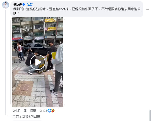 楊智伃也回文PO出當下側錄的影片反嗆「我到門口迎接你送的水,還直接shot掉,已經很給你面子了,不然還要請你進去用水泡茶嗎?」