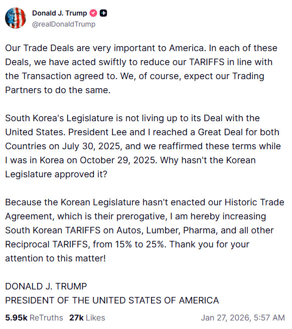 美國總統川普27日在自家社群平台「真實社群」(Truth Social)發文宣布,因韓國國會遲遲未通過去年與美方談定的貿易協定,將對韓國多項商品調高關稅,稅率由原本15%提高至25%,涵蓋汽車、木材、製藥等關鍵產品。消息一出,引發國際市場震盪,也讓外界高度關注美國對盟邦施壓的最新動向。