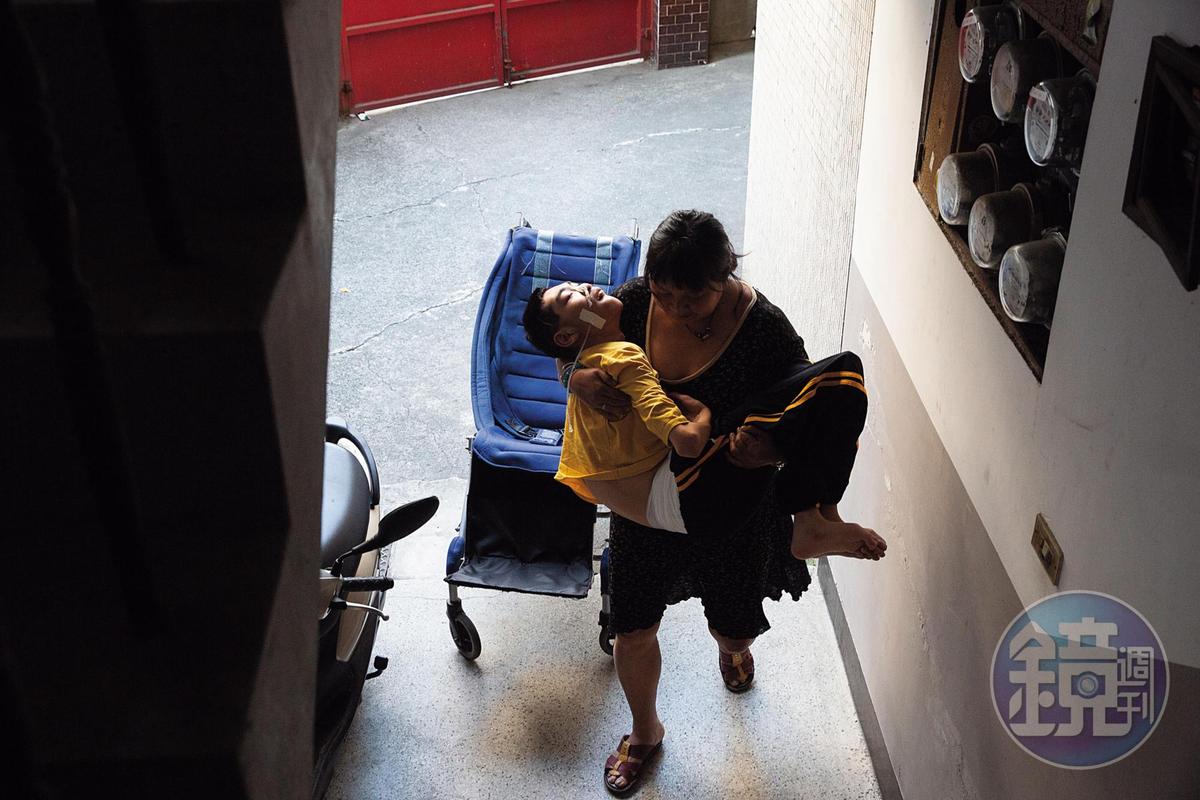 ▲小比6個月大時確診極重度腦麻,整整18年,陳嘉齡都這樣抱上抱下。(圖/鏡週刊)
