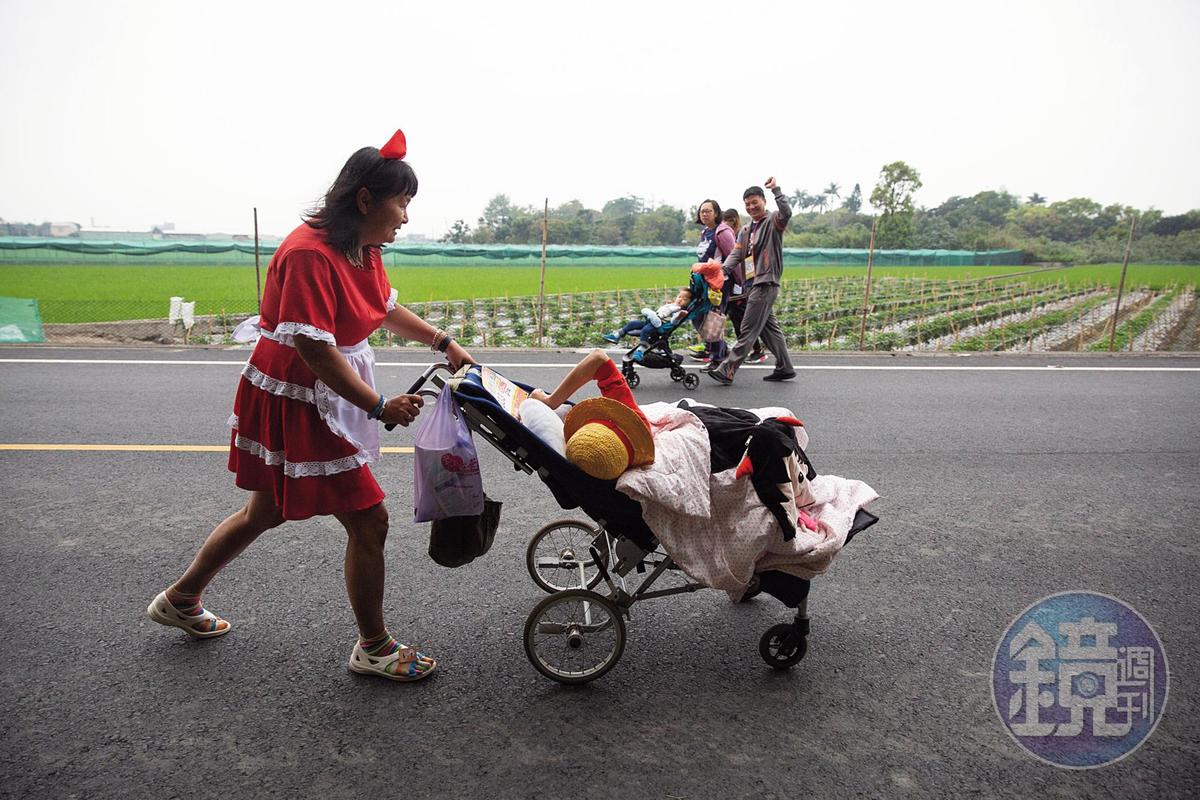 ▲穿著女僕裝的陳嘉齡,把兒子打扮成動漫人物魯夫,那是她最喜歡的角色,「有打不死的精神」。路過的跑友帶著孩子,大聲為他們加油。(圖/鏡週刊)