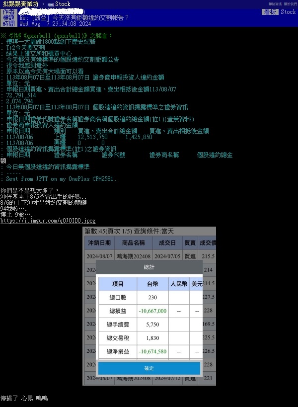 苦主發文表示,大多數人是不是誤會了什麼,當沖客基本上8月5日是不會出手的,8月6日的上沖下洗才是違約交割或導致賠錢的關鍵,並附上了對帳單,可以看到苦主自7月初陸續買進共230口鴻海期貨,但卻在2日停損出場,大賠約1066萬。