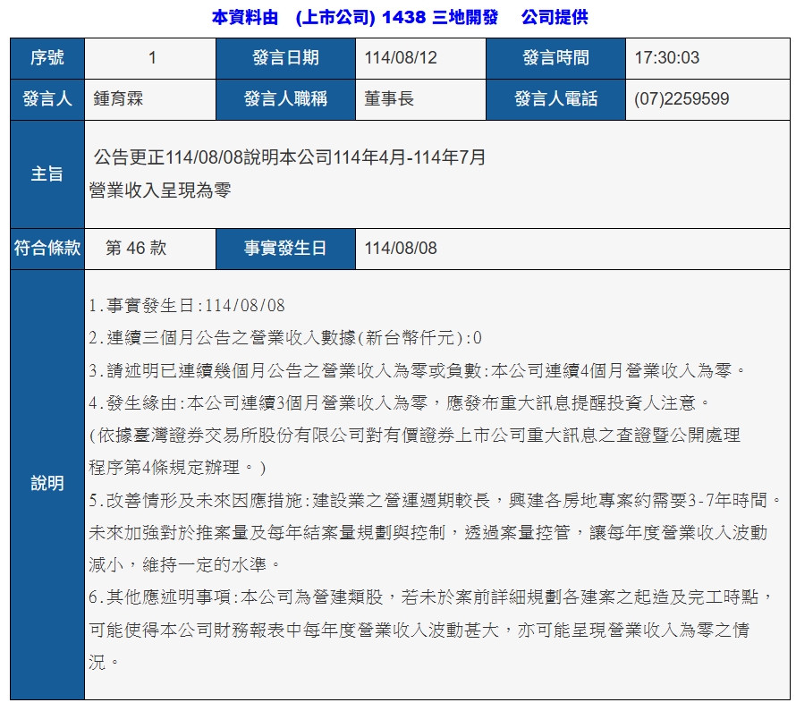 上市營建公司三地開發(1438)昨(12)日傍晚公告更正8月8日的重大訊息,揭露今年4~7月營業收入均為零,已連續4個月無營收入帳。公司澄清,並非營運停擺,而是因建設業營運週期長、建案起造與完工時間差所致,屬產業特性,未來將加強推案與結案節奏控管,減少年度財報波動。