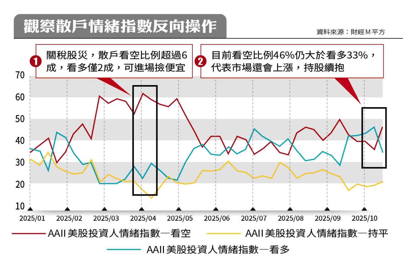 他補充,除了台股融資維持率指標外,還有一個相當好用的反指標,就是「AAII投資人情緒指數」。「該指數是美國針對未來6個月,投資人對市場看法所做的調查,當散戶過度看空市場時,常伴隨落底訊號;當看多、樂觀情緒高漲時,股市多會修正,所以只要看空比例大於看多,股市會繼續漲,反之就要居高思危。」施雅棠說明。