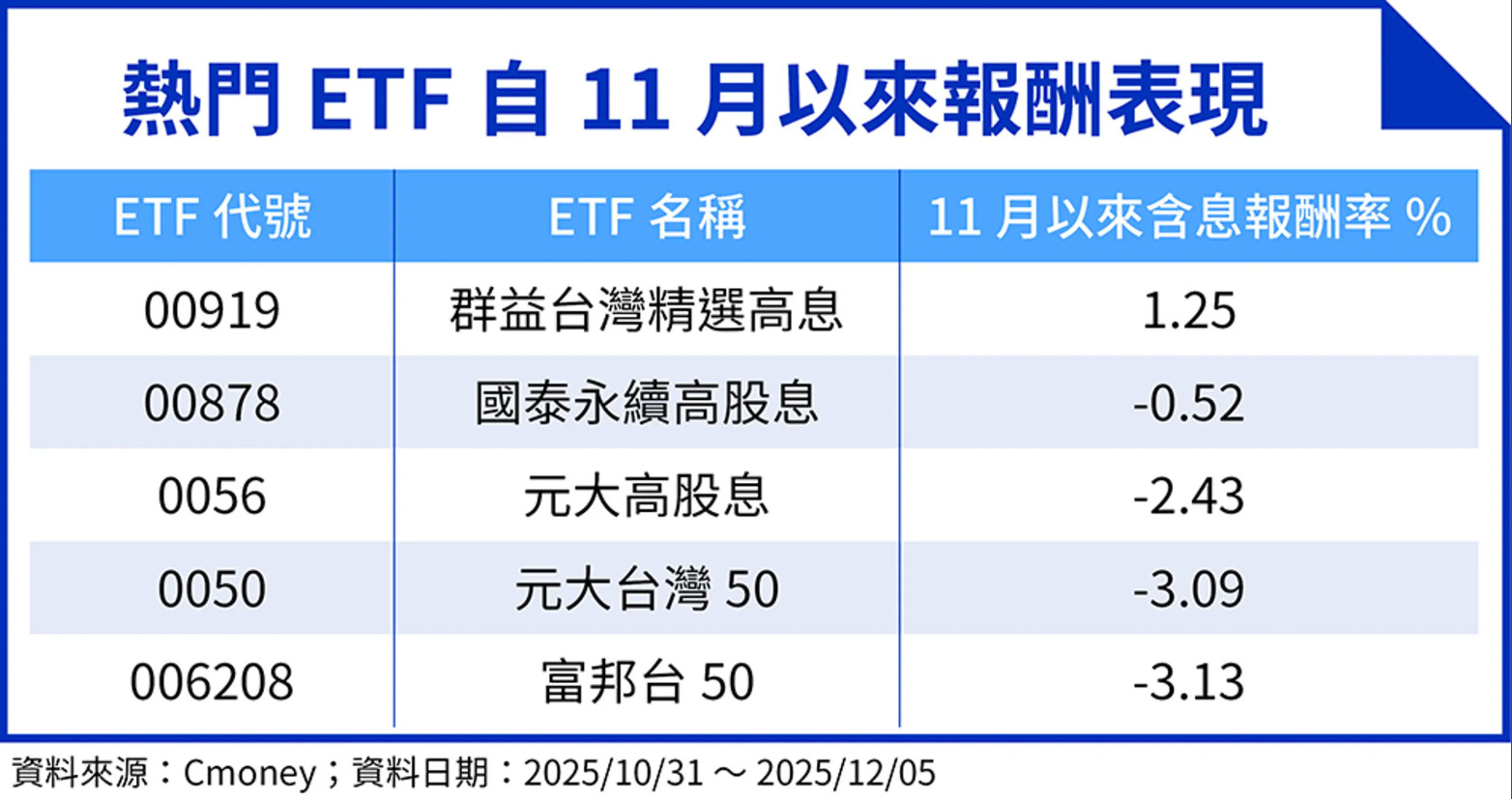 ▼熱門ETF自11月以來報酬表現(圖/資料來源:Cmoney;資料日期:2025/10/31至2025/12/05、鏡週刊製表)