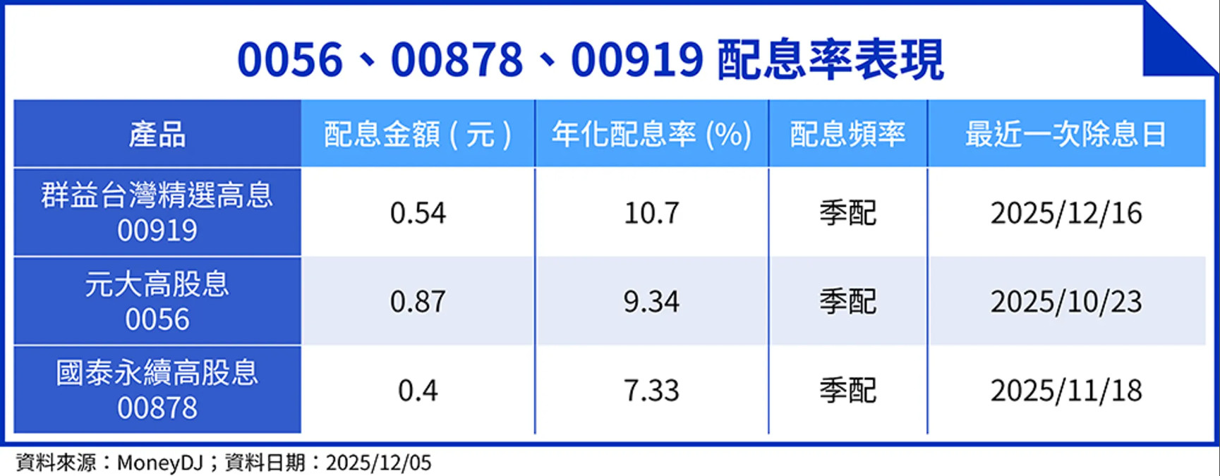 ▼0056、00878、00919配息率表現 (圖/資料來源:MoneyDJ;資料日期:2025/12/05、鏡週刊製表。)