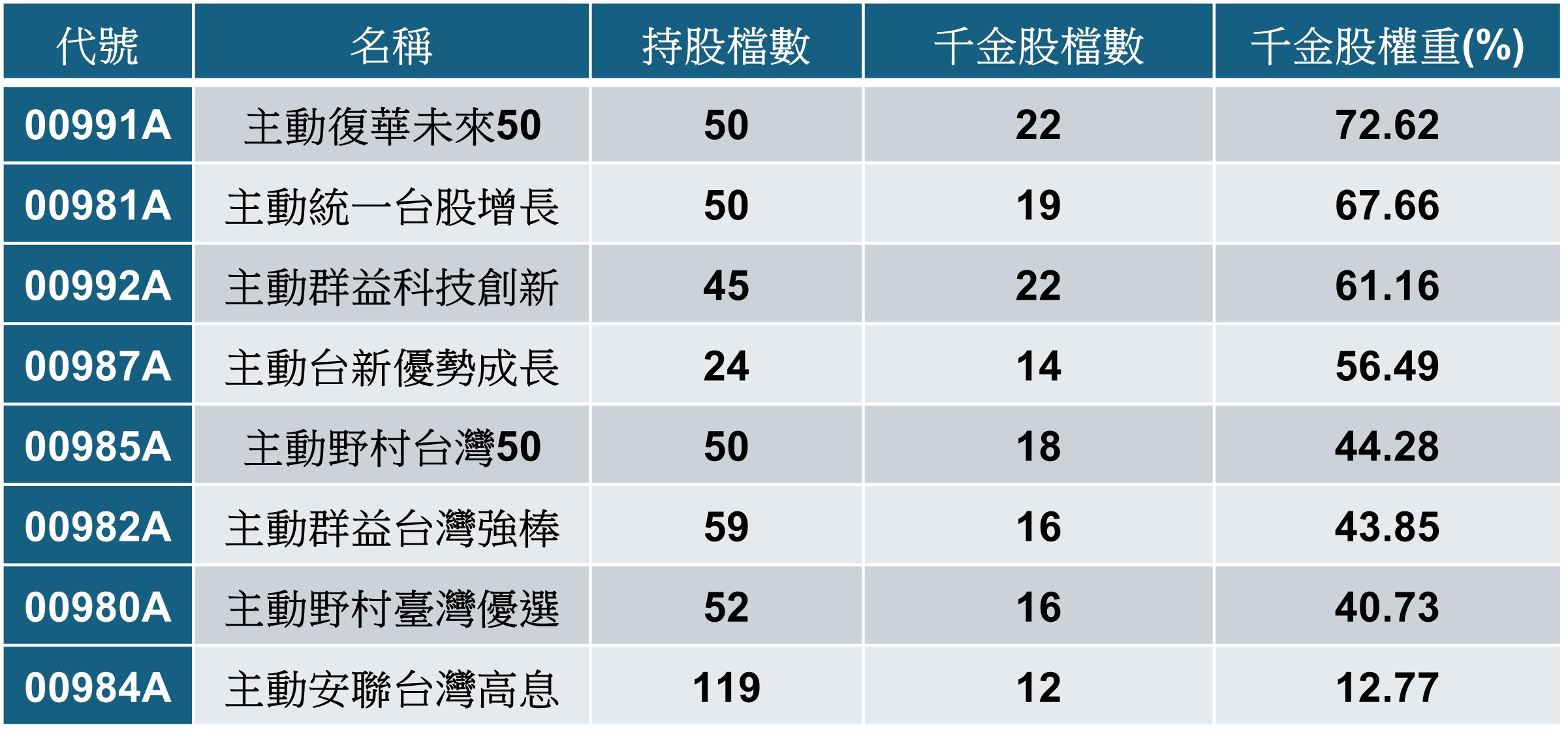 8檔台股主動式ETF 00991A含「千金」量最濃