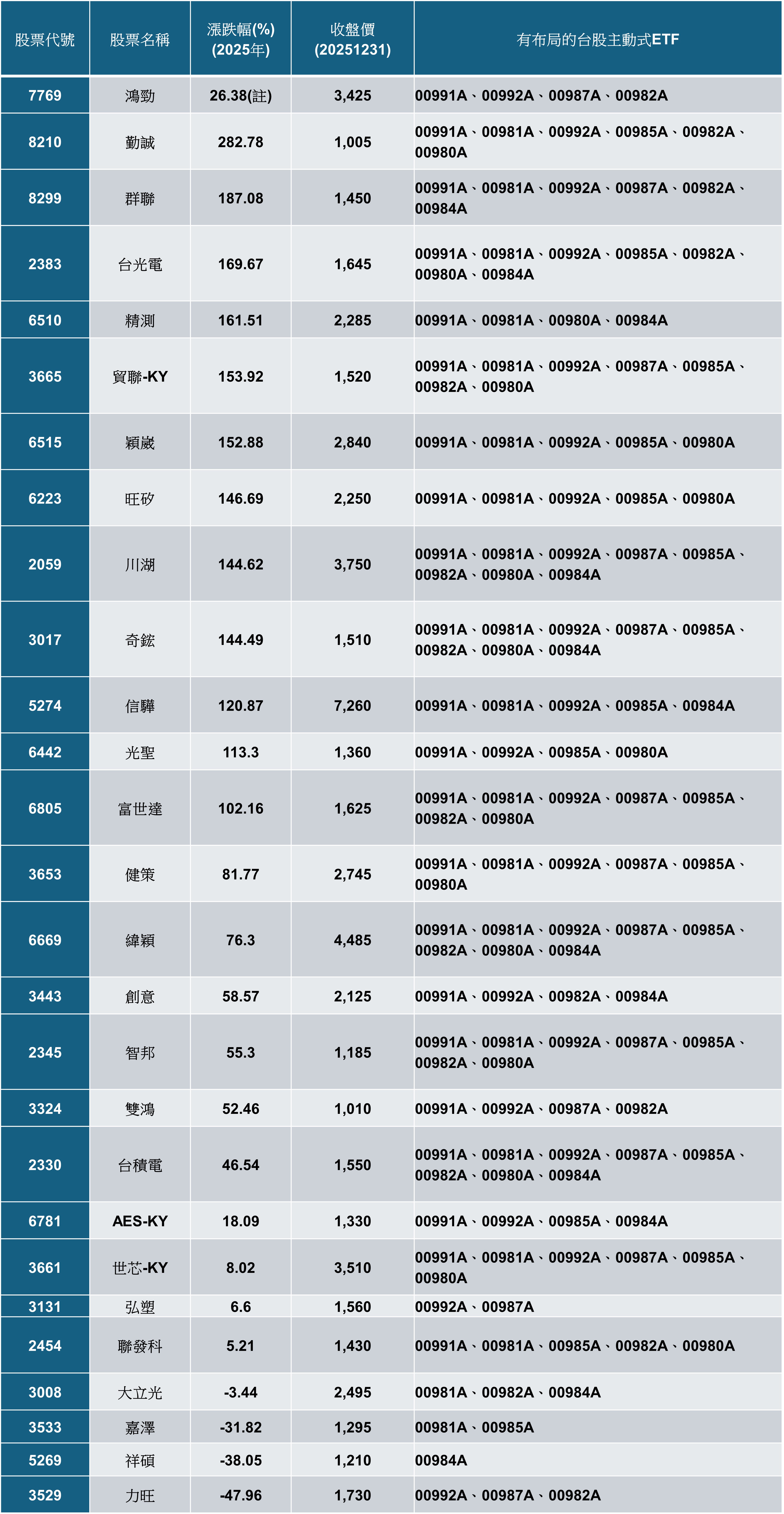 註:鴻勁(7769)報酬率區間為上市日2025/11/27至年底2025/12/31。