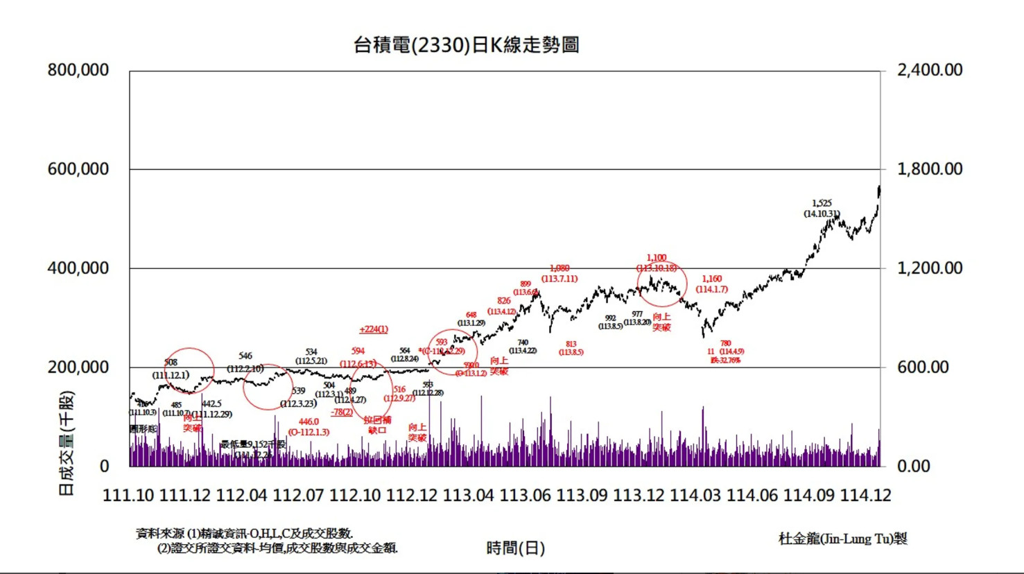 「天量伴隨著天價,台積電攻上歷史高價後,回檔未達20%,表示仍有上攻動能,可以先賣一點,獲利入袋。」杜金龍教戰,回檔幅度約5%~7%時再接,且要「賣多買少」,例如賣出15%持股,只接回5%,保留銀彈。等待1/15法說會後,若出現明顯回檔再低接。