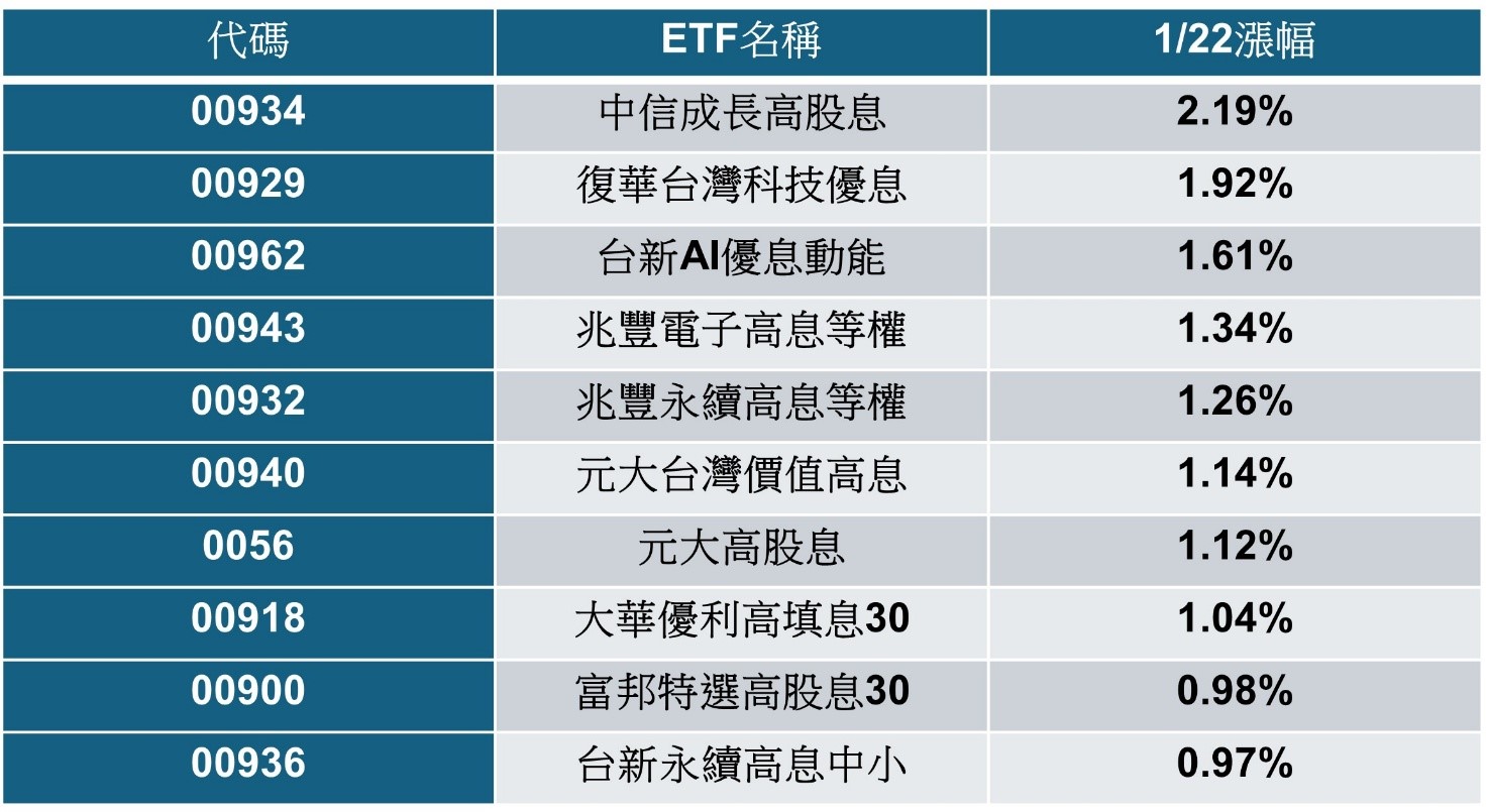 台股今(1/22)日在權值股領軍下強勢反彈,加權指數大漲1.60%,高股息ETF同步走強,以中信成長高股息(00934)、復華台灣科技優息(00929)表現最為亮眼,分別勁揚2.19%、1.92%,包辦高股息ETF漲幅前兩名,不僅漲幅領先大盤,更打敗多檔主動式台股ETF,成為市場矚目焦點。