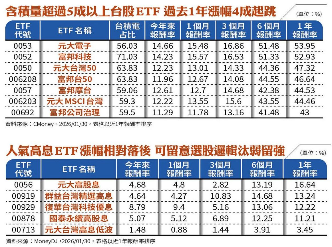 再就基本面來說,高股息ETF持股相對偏重的金融、傳產股,未來一年獲利可期。「目前預估金融股獲利成長5至10%,傳產股成長10至15%,配合關稅疑慮消除,股價評價相對低,對保守資金來說,仍具一定吸引力。」施政廷建議,市值型ETF漲多可先落袋,積極型投資人可換檔再上,以主動出擊取代被動投資。