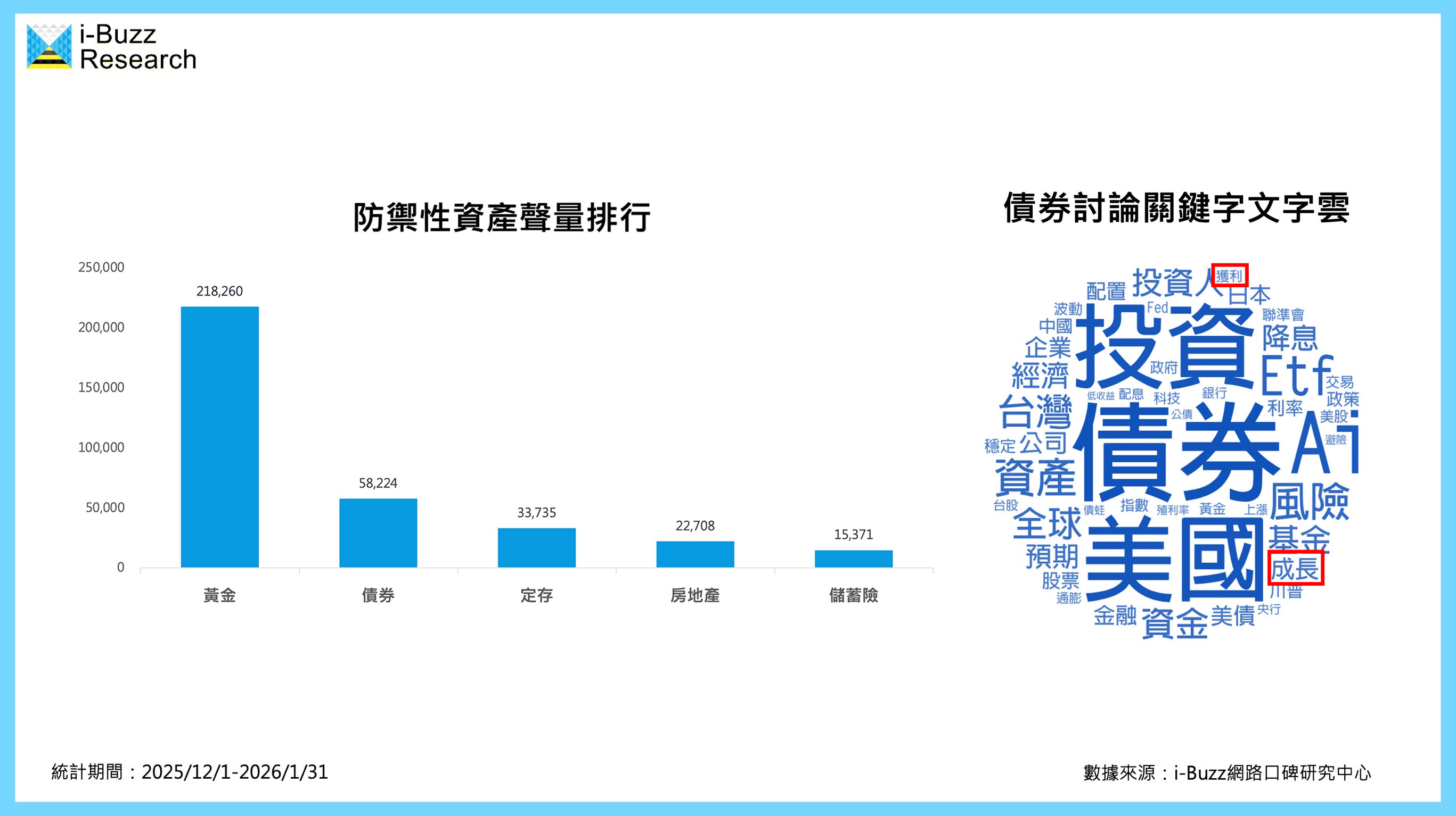 ▼防禦性資產聲量排行及債券討論關鍵字文字雲。(圖/i-Buzz網路口碑研究中心提供)