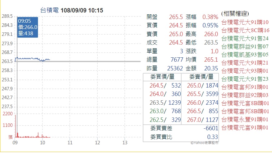 晶圓代工龍頭台積電 (2330-TW) 將於周二 (10 日) 公告 8 月營收,由於美系手機大廠新機將於 9 月問世,加上華為 5G 新機啟動拉貨,7 奈米出貨動能顯著升溫,法人估台積電 8 月營收將續揚,月增幅可望超過 1 成,有機會逼近、甚至超越千億元。台積電在今(9)日股價持續走高,早盤以265.5元開出,一度拉升至266元,盤中漲幅0.56%。