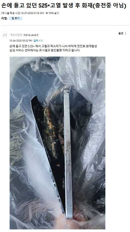 南韓三星論壇近日出現一起Galaxy S25+手機自燃事件,引發消費者熱議。根據使用者「처으이잔아(Cheoeuijan-a)」於10月27日凌晨在三星官方論壇的發文顯示,使用者稱自己手持的S25+在「非充電狀態」下突然過熱,隨後發出「砰」的一聲後起火燃燒。使用者表示,他立即將手機丟到地上才避免更大火勢,之後送往三星服務中心檢測,但得到的答覆是「原因不明」。