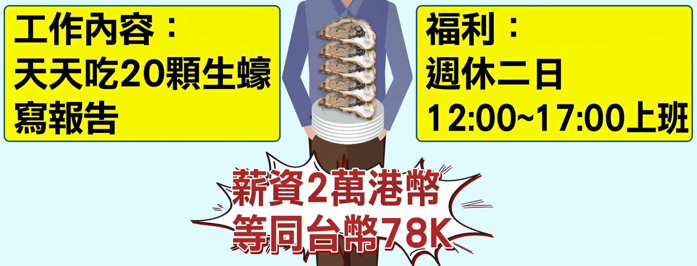 香港這間生蠔店貼出公告要徵品蠔專員,工作就是天天吃20顆生蠔寫報告,不僅週休二日,每天上班5小時,薪資2萬港幣,相當於台幣78K。烤生蠔同業,洪嘉隆:「肝不好的話建議盡量不要生吃,因為它裡面會有海洋弧菌,對身體來說會比較有負擔。」