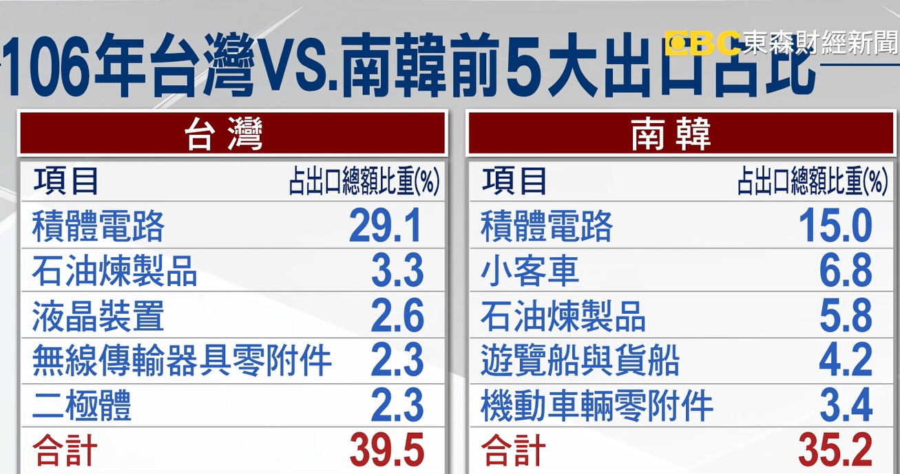 經濟部也示警,就因為台灣出口集中度高,國際一點風吹草動都會遭到牽連,前五大出口貨品就占了總額的四成,積體電路更將近三成之多,相較於對手南韓只有15%,高出快要一半。
