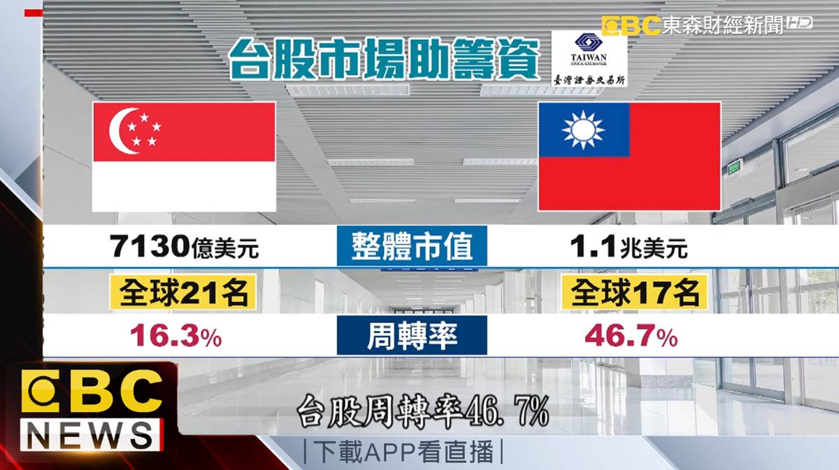 和東協國家比較,台股市值、流動性具有領先地位,根據統計,新加坡證交所上市公司整體市值約7130億美元,但台灣則高達1.1兆美元,世界排名17,遙遙領先,更別提馬來西亞或泰國,而台股周轉率46.7%,也遠勝新加坡的16.3%。
