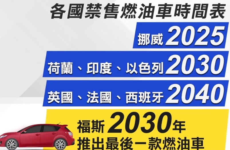 但其實不只是台灣,挪威早就宣佈2025年,燃油車全面禁售,荷蘭、印度、以色列定在2030年,英國法國西班牙2040也要跟進,就連汽車大廠福斯,也宣佈2030年推出最後一款燃油車後,全面轉型電動車生產。